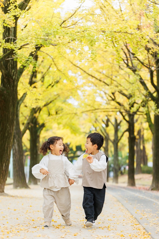 妹ちゃんを笑わせるために、お兄ちゃんがベー。そんな妹想いのお兄ちゃんの優しさが伝わる写真です。銀杏並木を歩く二人の笑い声が今にも聞こえてきそうです。